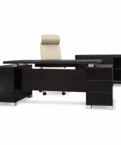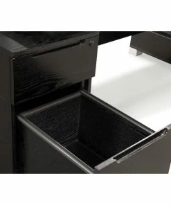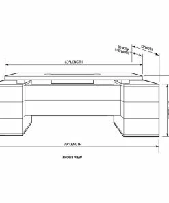 Stunning elegance and a floating desktop define the elite 79-inch Ford Desk. The finish is a smooth black stain over an American oak wood veneer. This is accented with silver painted wood feet and risers plus a black panel on top with ports for wire management. It features four drawers with ball bearing slides for ample and effortless storage at your fingertips. Each pedestal features a dual lock with a top drawer for general storage and the lower drawer with filing that fits both letter and legal files. To finish it off there is a wide keyboard tray that can also double as a notepad storage. Please note: Credenza shown is sold separately.
